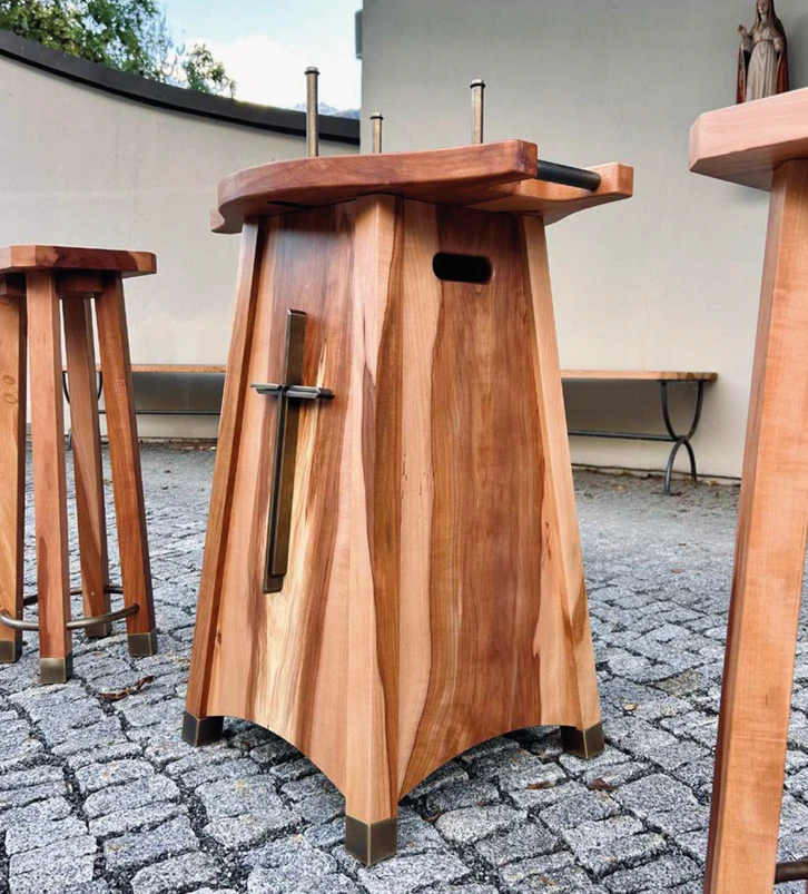 Aus dem Gedanken heraus, etwas Besonderes für die Gemeinde Umhausen zu schaffen, entstand die Idee, Urnentische aus Holz mit Messingelementen anzufertigen. Das dafür verwendete Holz des Apfelbaumes erzeugt zusammen mit dem Messing ein harmonisches und zurückhaltendes Designobjekt, das nicht nur ästhetisch ansprechend ist, sondern auch funktionale Zwecke erfüllt. Die Tische sind so gemacht, dass verschiedene Urnen darauf fixiert werden können. Zudem kann der obere Teil des Tisches zum Tragen der Urne abgenommen werden. Drei Urnentische und jeweils zwei dazu passende Beistelltische wurden für Umhausen, Tumpen und Niederthai angefertigt. Damit bereichern die Gedenkmöbel die Begräbniskultur der Gemeinde und tragen zu einer würdevollen Urnenbeisetzung bei.